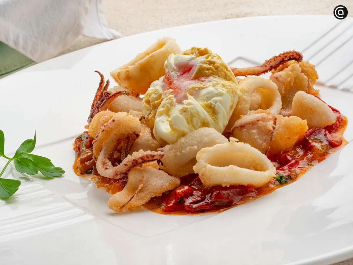 Sirve los chipirones crujientes con piquillos y huevo poché