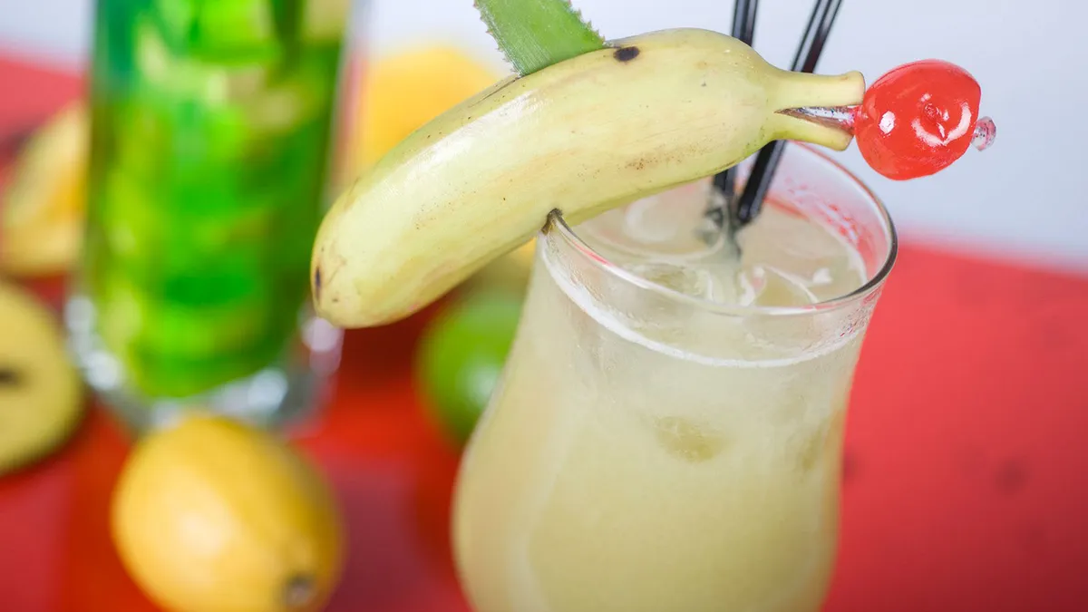 Cóctel Banana stick (con alcohol), un cóctel a base de ron, licor de plátano verde, zumo de piña y pulpa de plátano.