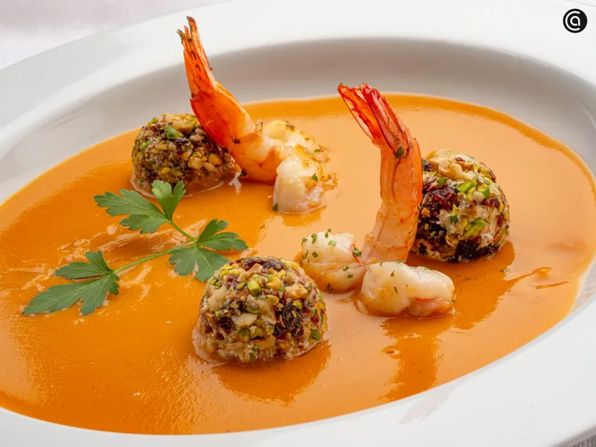 Crema de langostinos y bolas de queso con frutos secos, receta de Joseba Arguiñano