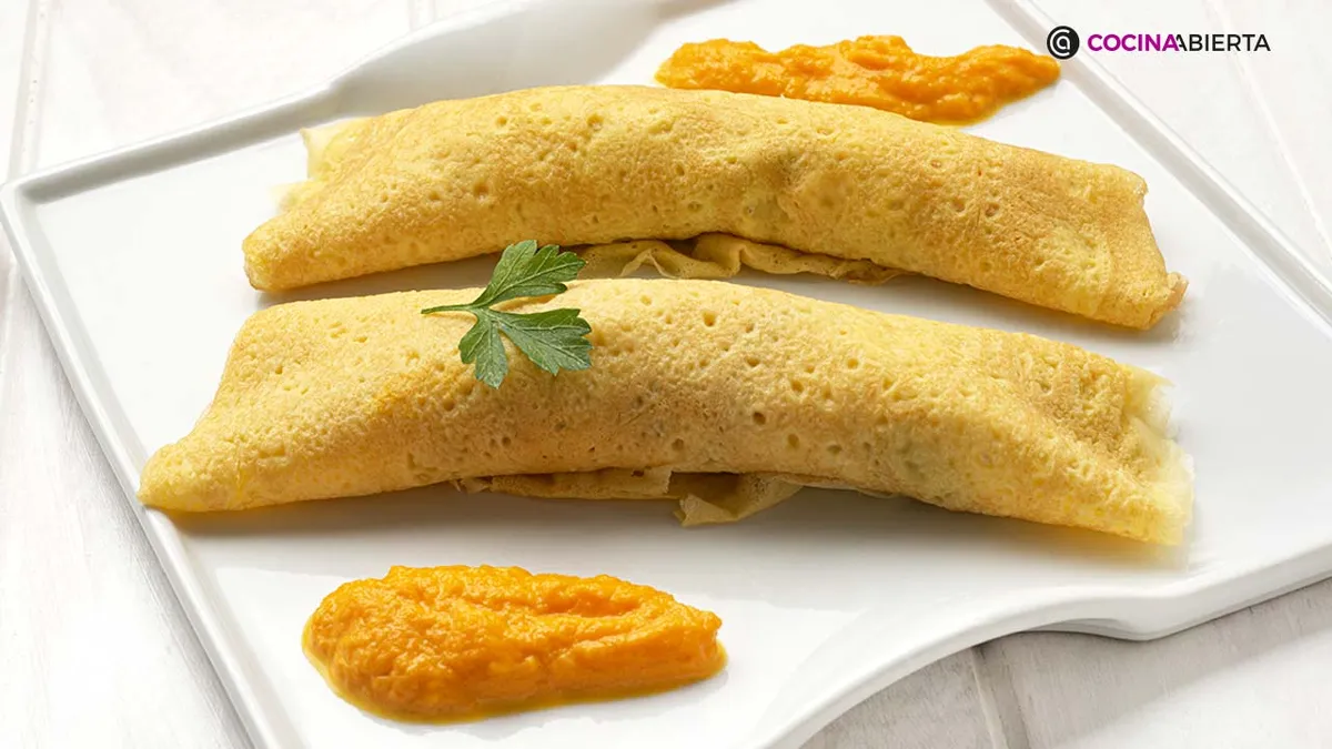 Sirve 2 crepes en cada plato con unas hojas de perejil como decoración y acompáñalos con un poco de crema de zanahoria. ¡Una delicia!