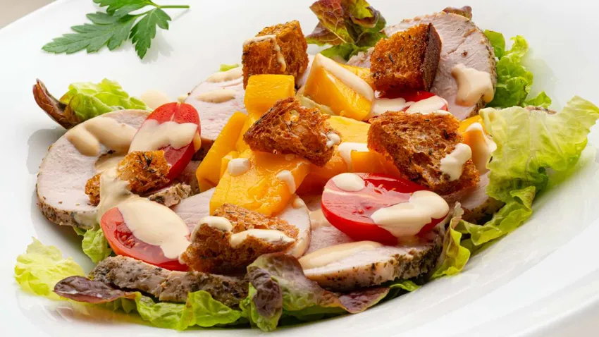 Esta receta fresca lleva pechuga de pavo, lechuga, dados de mango y tomates cherry. Se aliña con una mezcla de mayonesa y salsa de soja, y se completa con el toque crujiente de unos picatostes.