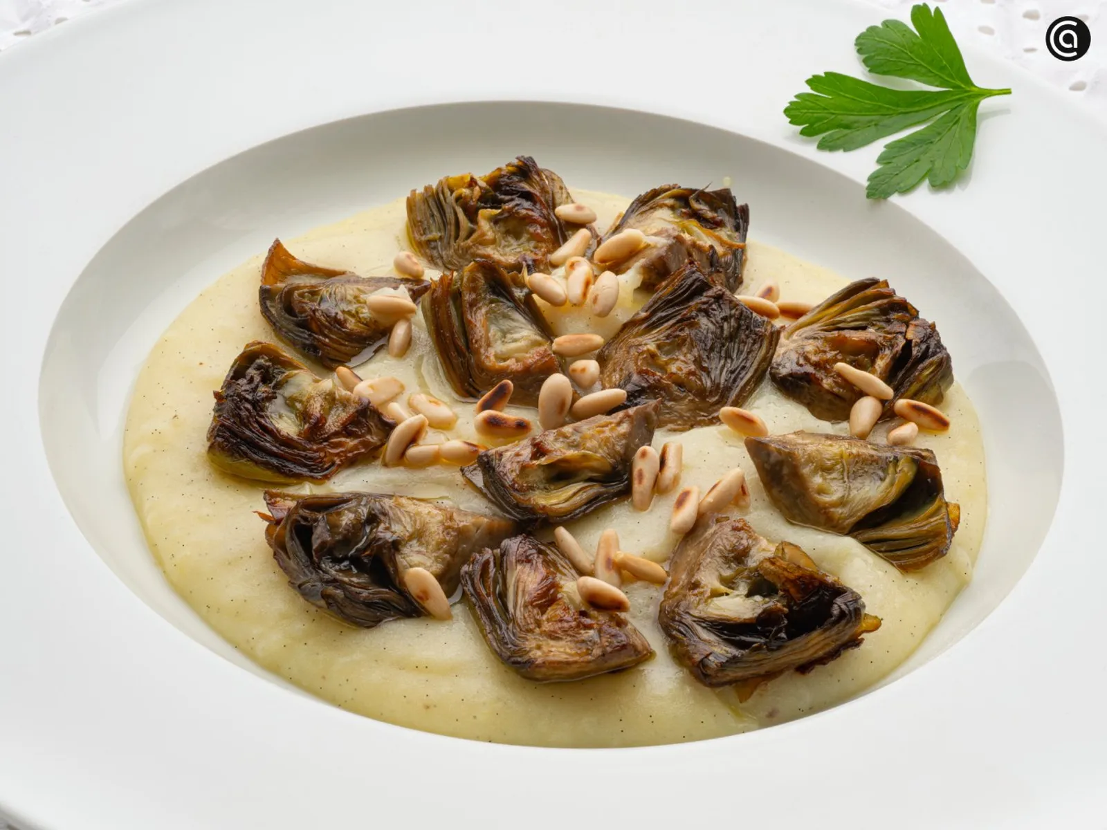 Alcachofas con puré de patata avainillado y piñones, receta de Karlos Arguiñano