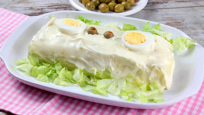 Receta de brazo de gitano de puré de patata y mayonesa con relleno de langostinos, atún y aceitunas.