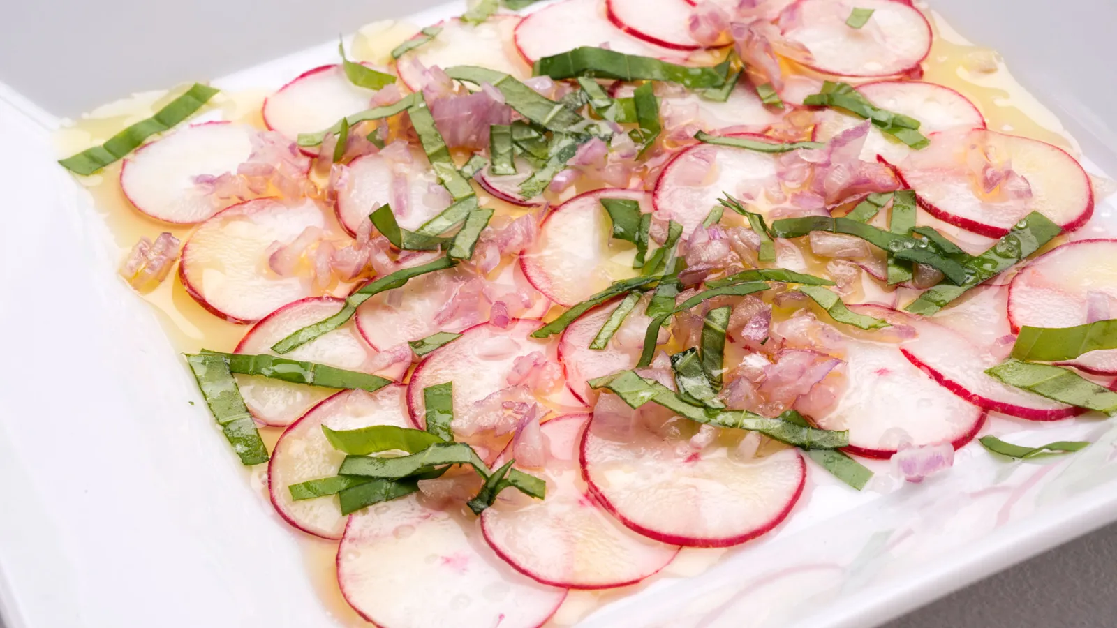 Karlos Arguiñano prepara un carpaccio de rabanitos con albahaca, chalota y zumo de lima, un plato sencillo y apto para vegetarianos y veganos.