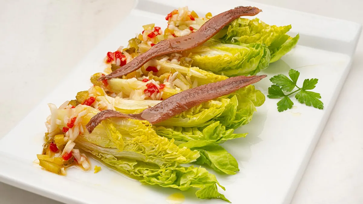 Sirve 1 cogollo en cada plato y aderézalos con la vinagreta. Reparte encima los filetes de anchoa. Decora los platos con unas hojas de perejil.