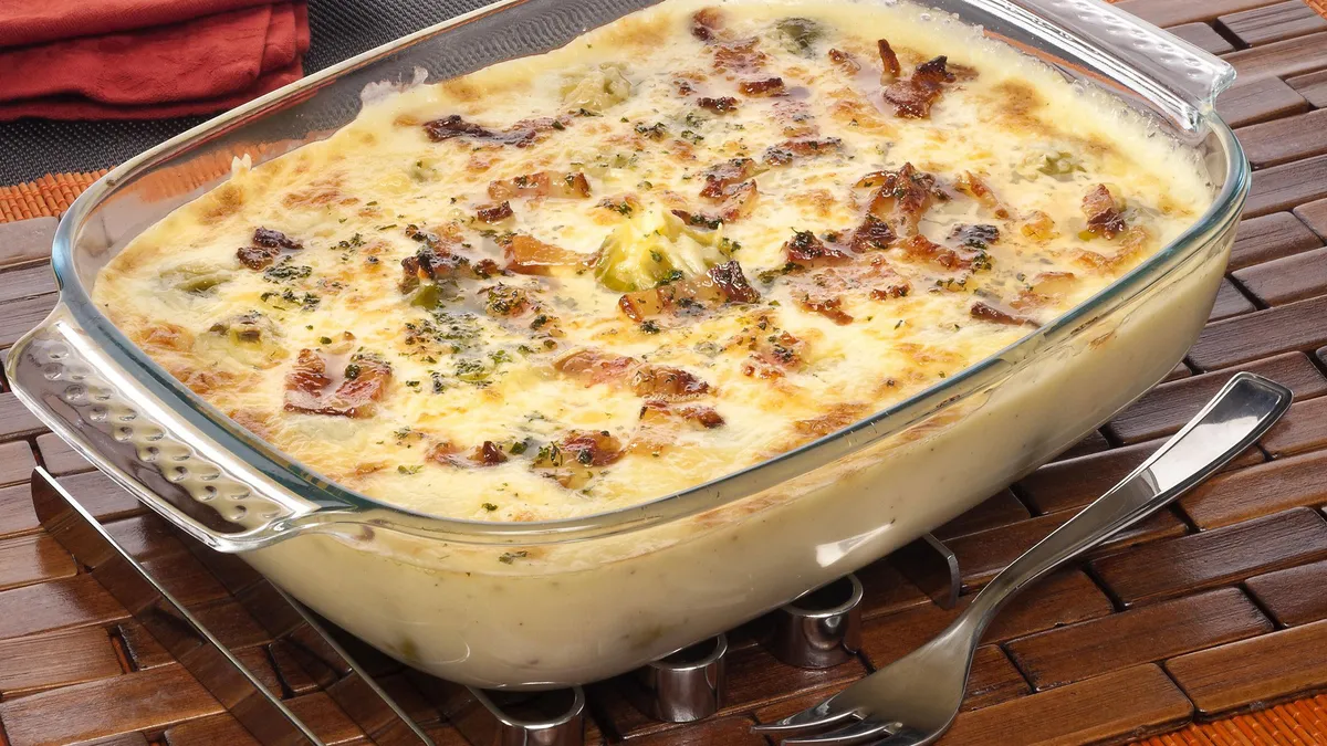 Receta de coles de Bruselas con puré de patata y puerro y gratinadas al horno con queso y panceta.