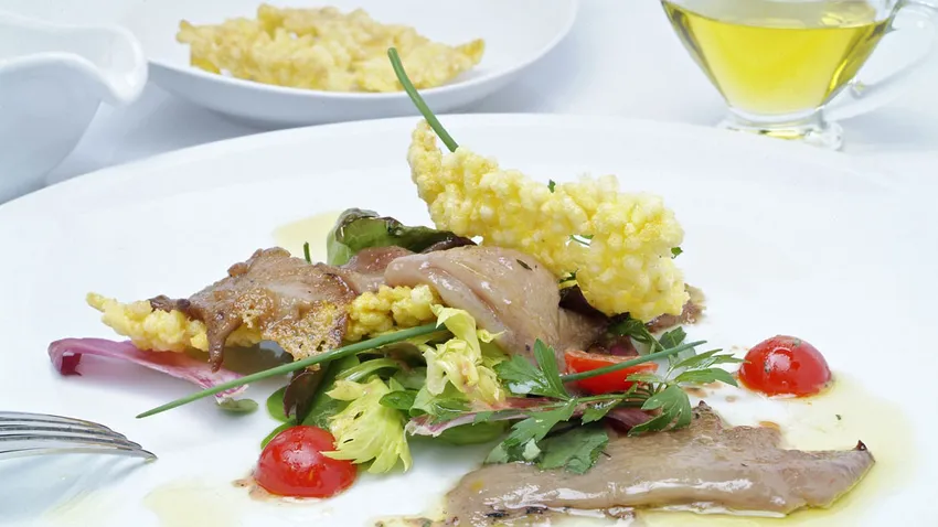 Receta de crestas de gallo fritas con ensalada y crujiente de arroz, una ensalada original y fresca con tomates cherry, diferentes lechugas. Ideal para el verano. Receta de Bruno Oteiza.