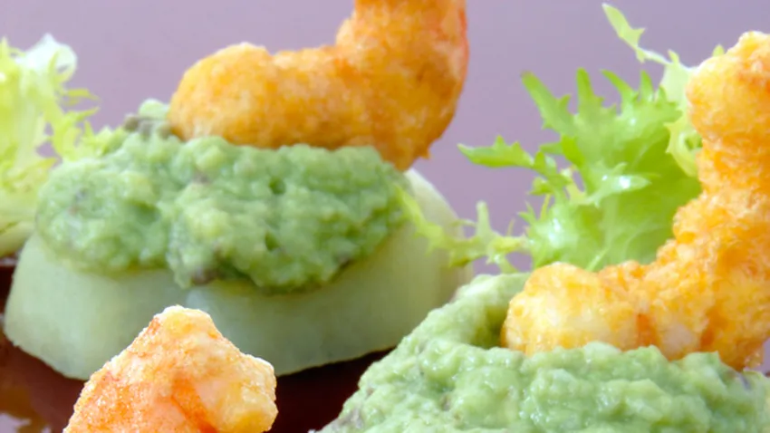 Receta de ensalada de aguacate y langostinos, un plato sencillo con patata, lechuga, langostinos rebozados y aguacate triturado sazonado. Receta de Karlos Arguiñano.