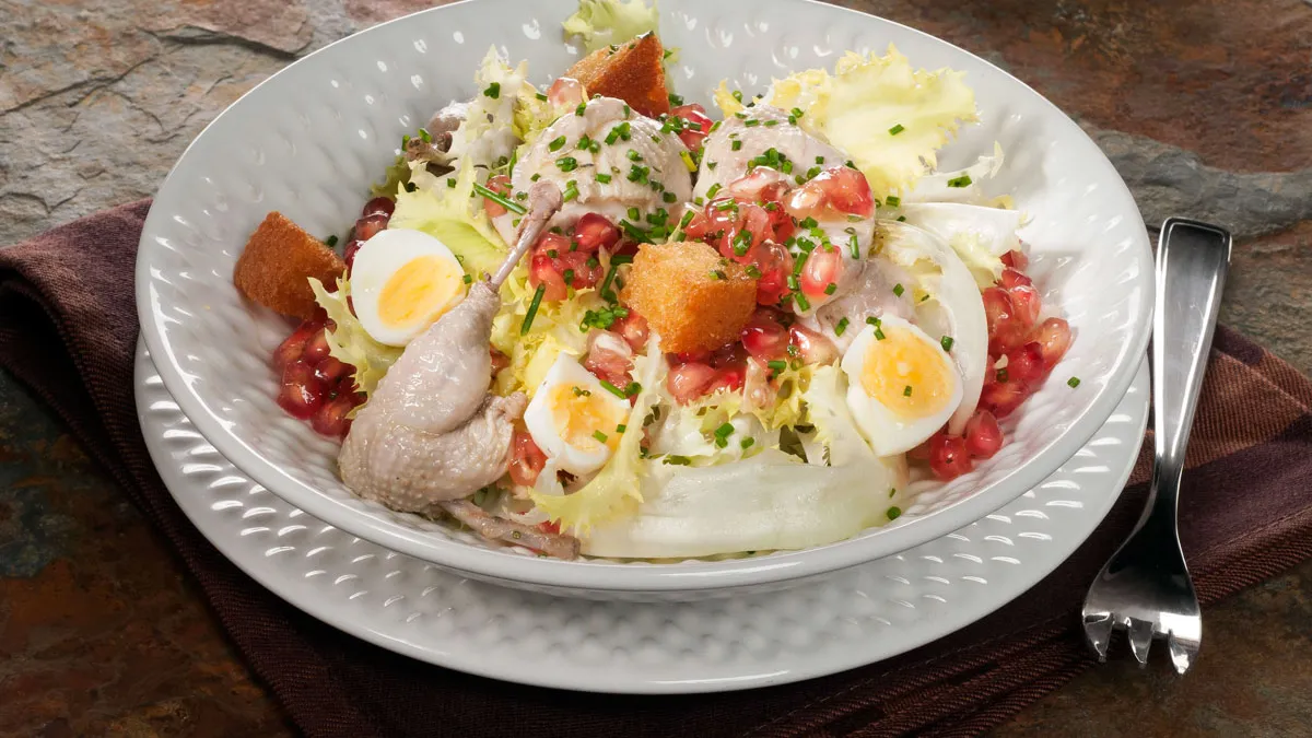 Receta de Bruno Oteiza de ensalada de codorniz escabechada, escarola, granada, costrones de pan frito y vinagreta casera, un plato muy completo y nutritivo.
