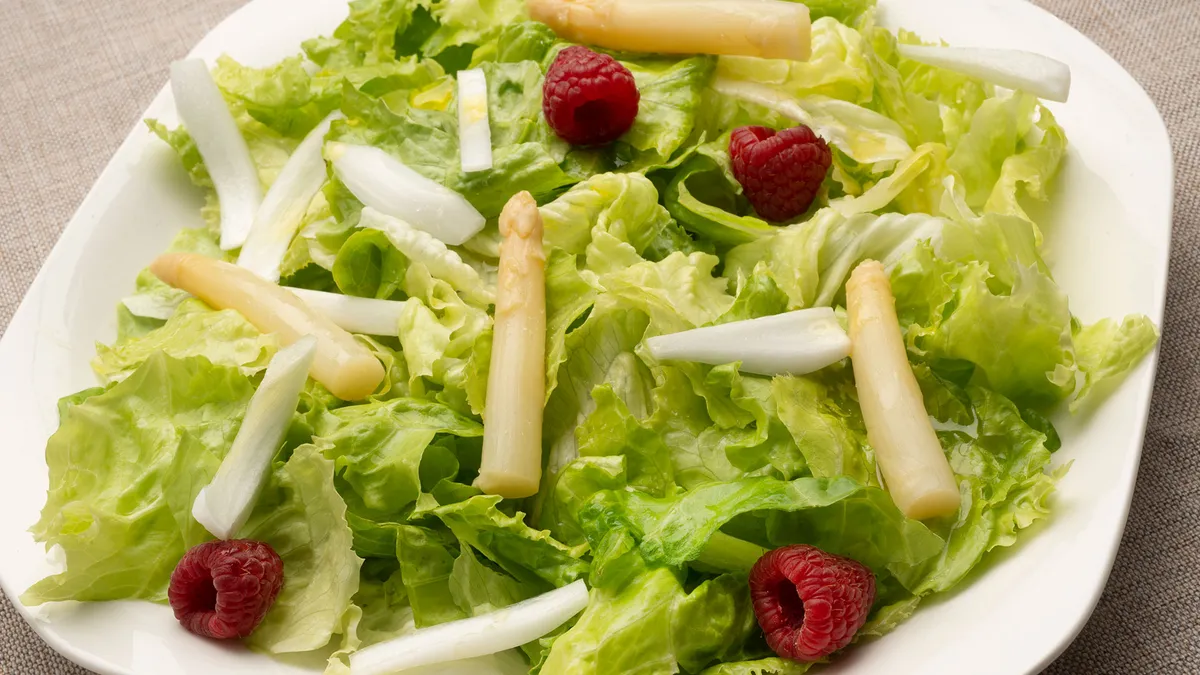 Aprende a preparar una ensalada fresquita y ligera de lechuga, espárragos blancos, cebolleta y frambuesas con nuestro cocinero Karlos Arguiñano.