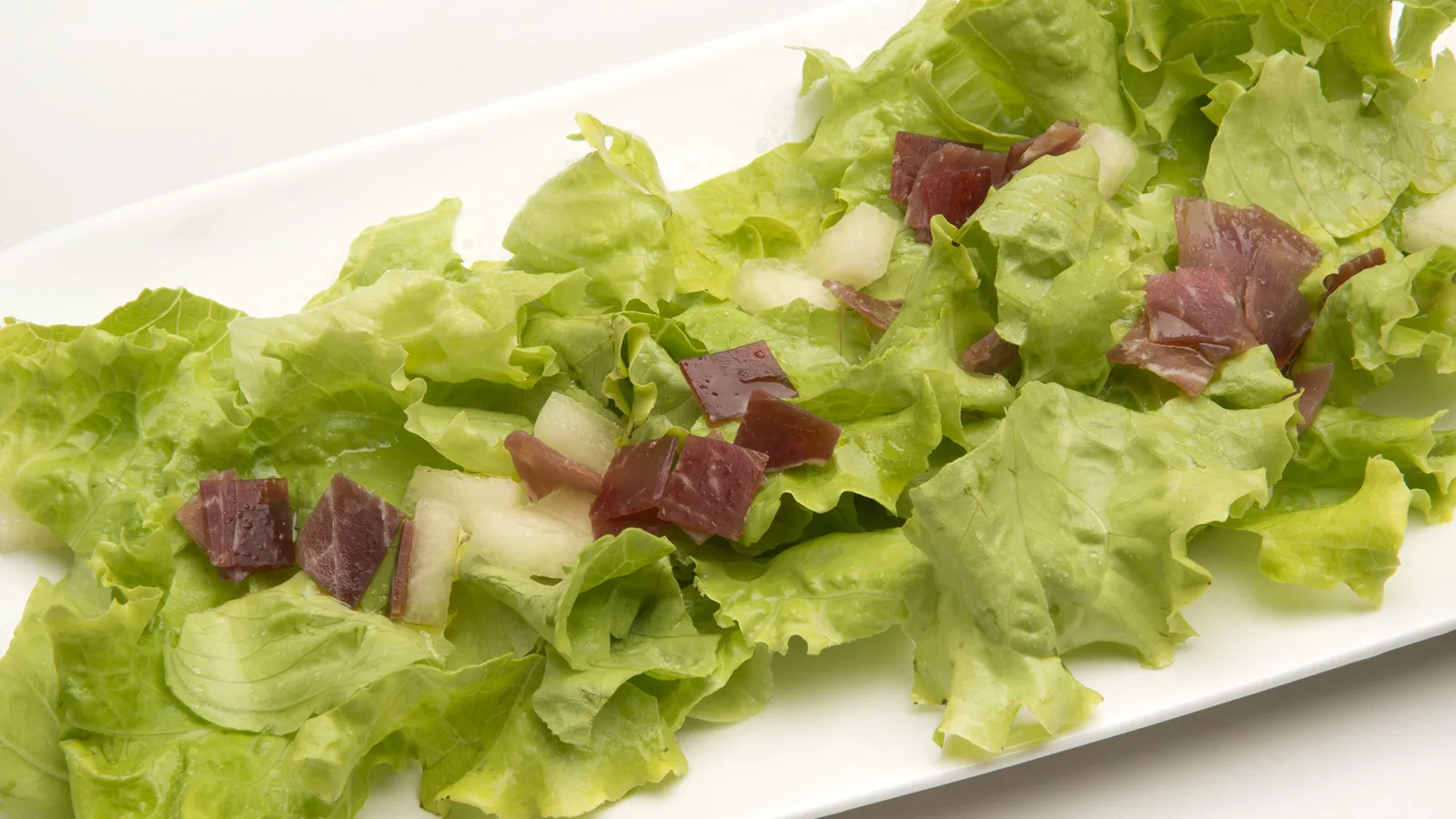 Ensalada fácil de lechuga con taquitos de melón y jamón serrano, la propuesta de Karlos Arguiñano para servir como guarnición de otros platos.
