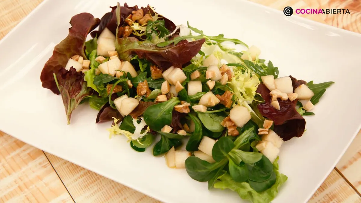 Una forma perfecta de enriquecer tus ensaladas es añadir lechugas variadas, frutas de temporada y frutos secos. En esta receta Karlos Arguiñano te propone aprovechar las peras dulces de otoño para hacer una ensalada fresca con nueces y almendras, que le darán el punto crujiente. Un plato rico en fibra, antioxidantes, proteínas vegetales y grasas saludables gracias a los frutos secos y al aceite de oliva del aliño.