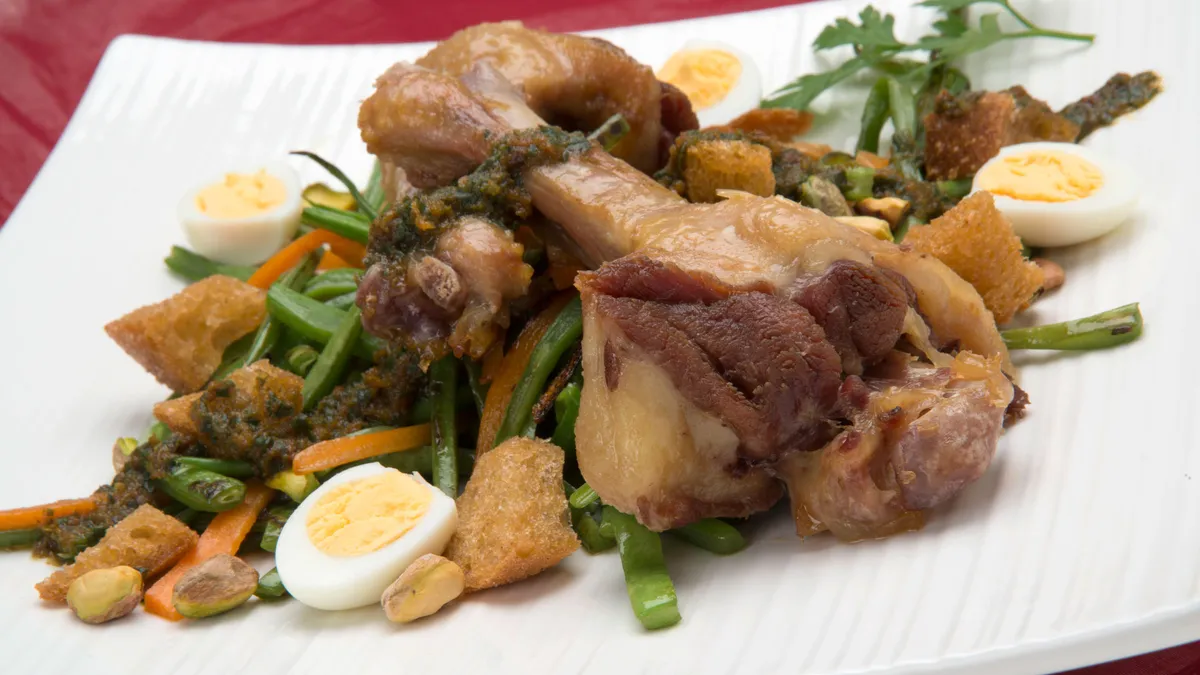 Karlos Arguiñano prepara una ensalada de judías verdes y zanahorias cocinadas en la barbacoa, manchones de pato a la parrilla, huevo cocido, picatostes y vinagreta de albahaca.