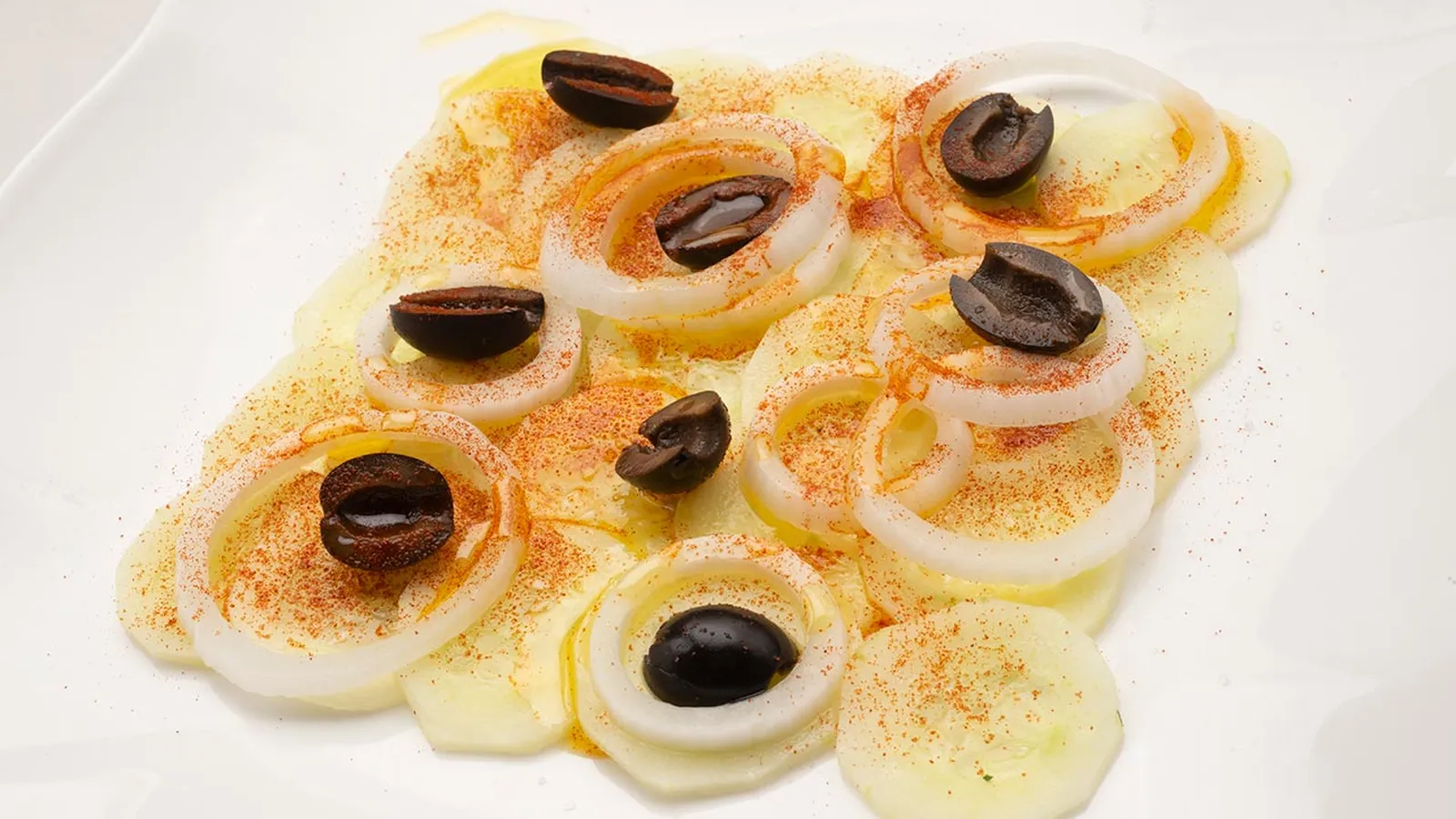 Karlos Arguiñano elabora la receta de acompañamiento Ensalada de pepino, cebolleta y aceitunas en su programa de televisión Cocina Abierta ¡menuda pinta tiene!