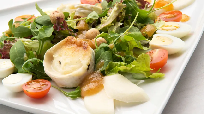 Receta de Karlos Arguiñano de ensalada de queso de cabra rebozado acompañado de vinagreta de membrillo, avellanas tostadas, huevos de codorniz, tomate y lechuga. Un plato perfecto para el otoño.