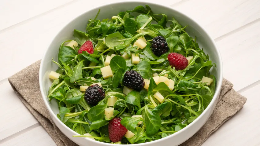 Ensalada de rúcula, canónigos, queso y frutos rojos