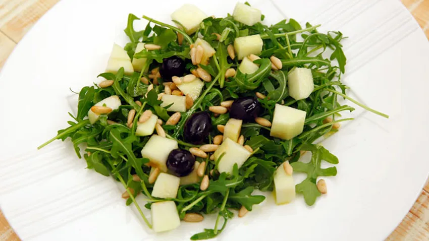 Receta de Karlos Arguiñano de ensalada de rúcula, manzana, aceitunas negras y piñones, un plato sencillo y saludable, apto para vegetarianos y veganos.