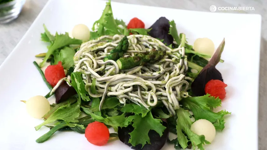 Para presentar la ensalada, os recomendamos disponer en un plato una cama con los espárragos y tirabeques salteados. Sobre ésta, añade cuantos brotes gustes, las bolitas de sandía y melón y gulas marinadas.