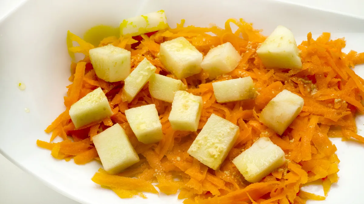 Karlos Arguiñano presenta una ensalada de zanahoria rallada con manzana en dados y aliño de mostaza y aceite de oliva, perfecto para servir como guarnición.