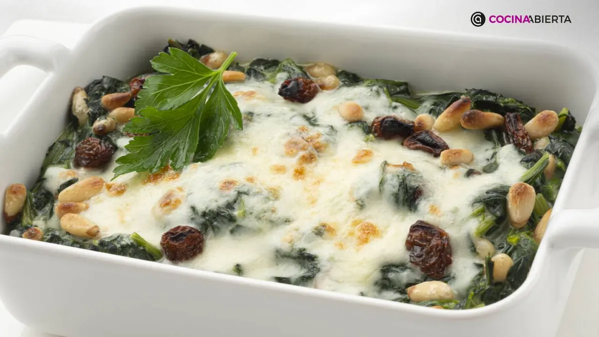 Preparamos una saludable receta de espinacas a la crema con pasas y piñones gratinadas, una receta vegetariana fácil, sana y rápida de elaborar, con el paso a paso de Karlos Arguiñano.