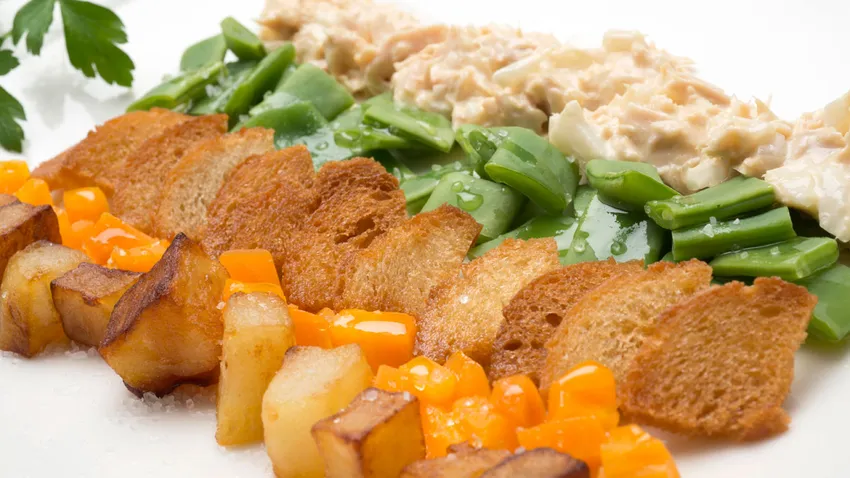 Sirve en filas: una de patatas, una de zanahorias, una de vainas, una de bonito y una de pan frito. Riega las hortalizas con aceite y sazónalas con sal gruesa. Decora con perejil. Decora con un hilo de aceite.