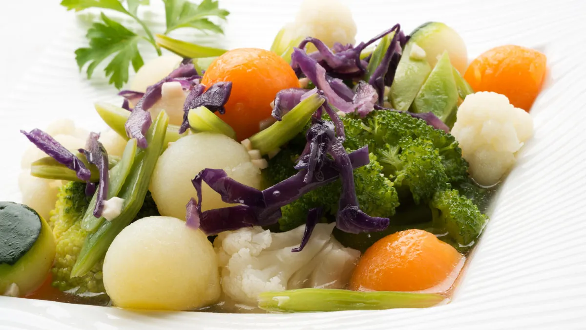 Receta de Karlos Arguiñano de macedonia de hortalizas (patatas, calabacín, calabaza, judías verdes, coliflor, brócoli...). Un plato vegetariano y vegano muy saludable y fácil de preparar.