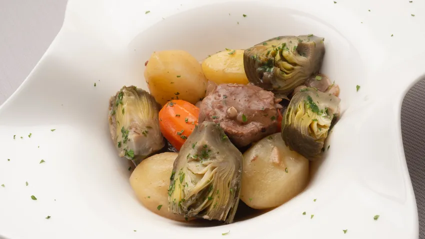 Agrega las patatas, las zanahorias y las alcachofas a la tartera de la carne guisada. Remueve la cazuela y cocina todo conjuntamente durante 3-4 minutos. Espolvorea con un poco de perejil picado y sirve.