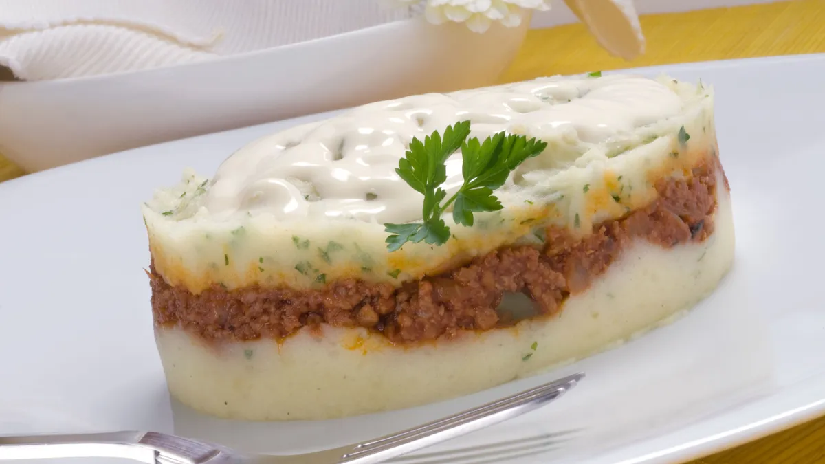 Pon un molde en el centro del plato y rellena una primera capa con puré de patata. Coloca encima otra capa de carne y termina con otra de puré con perejil. Desmolda y pon encima un poco de queso emmental. Decora con una hojita de perejil y sirve.