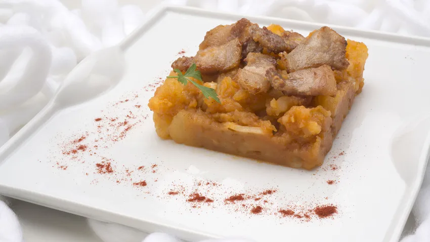 Karlos Arguiñano elabora la receta de patatas revolconas, un plato tradicional de Ávila, Salamanca y Cáceres a base de puré de patata al pimentón acompañado de carne de la matanza, en este caso, papada de cerdo.