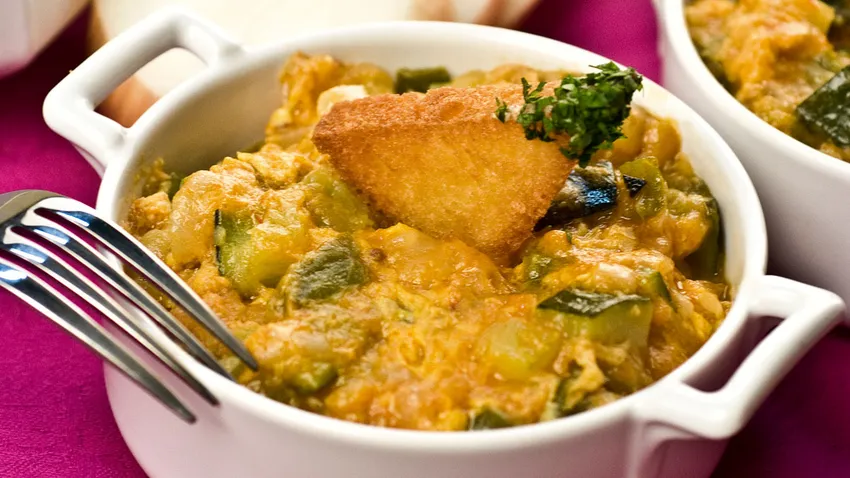 Sirve el pisto a la bilbaína y acompáñalo con los triángulos de pan frito.