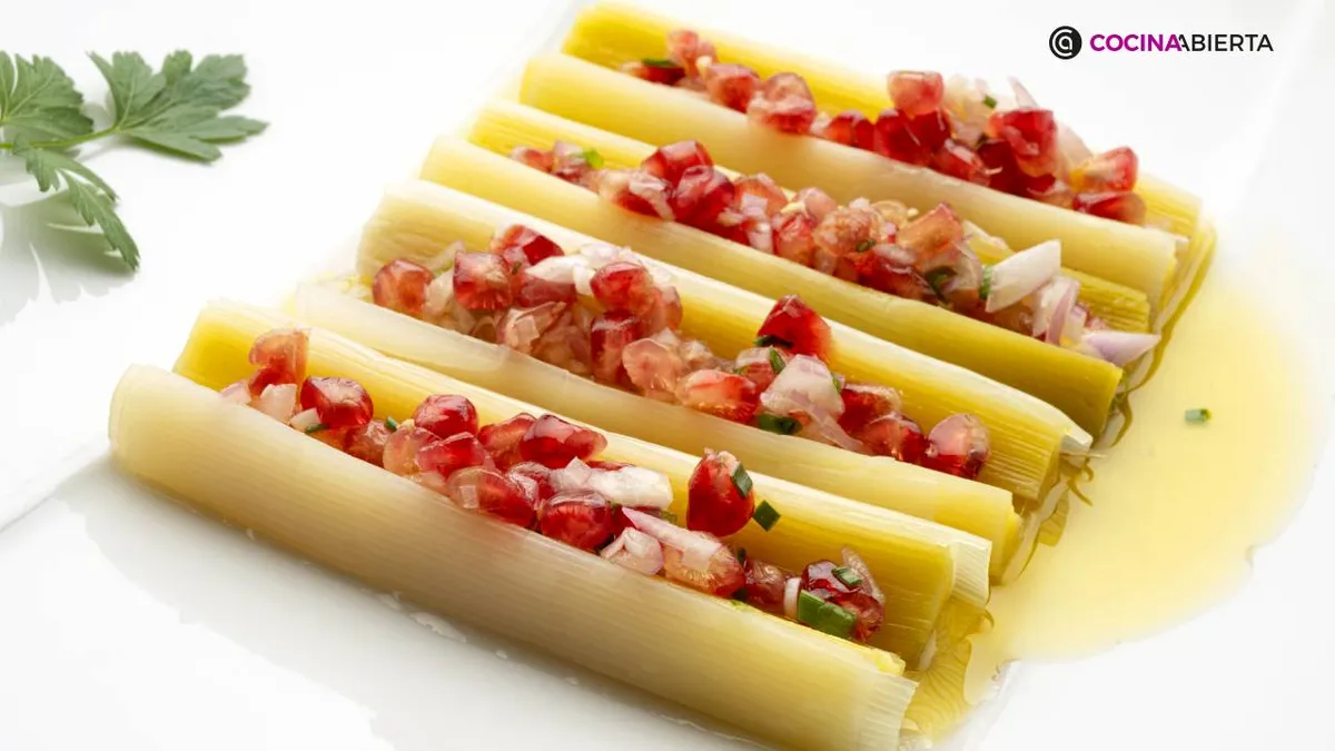 En esta ocasión, Karlos Arguiñano ha querido darle color a la vinagreta añadiéndole unas pepitas de granada. El sabor agridulce de esta fruta combinará a la perfección con los puerros cocidos.