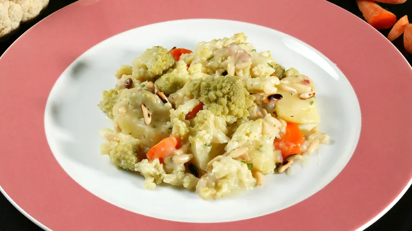 Receta de romanesco con salsa de verduras y acompañado de piñones tostados.