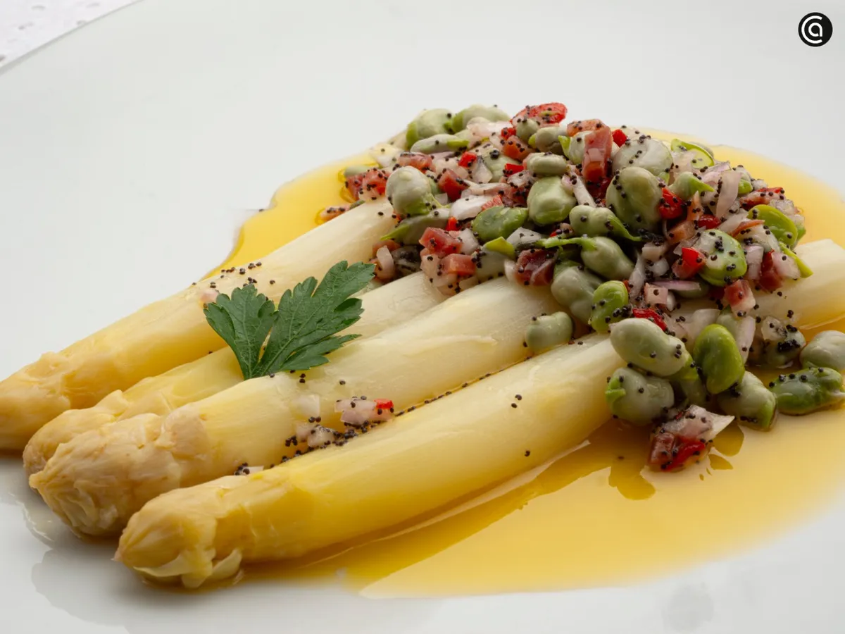 Karlos Arguiñano prepara espárragos frescos con habitas, una receta de verduras sencilla y muy ligada a la cocina de primavera. Los espárragos blancos se cuecen hasta quedar tiernos y se sirven con una vinagreta de habitas con semillas de amapola.