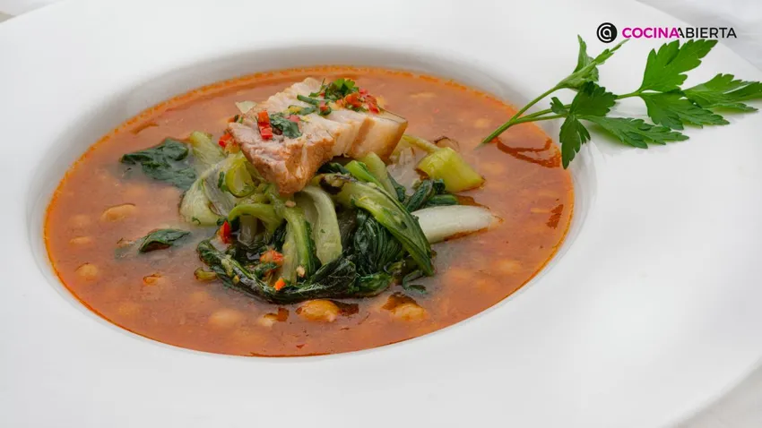 Este plato de legumbres se cocina en la olla rápida con tocino y un hueso de jamón. Es ideal para incorporar el pak choi, una col china. 'Os va a sorprender lo rica, tierna y nutritiva que es', asegura Joseba Arguiñano.