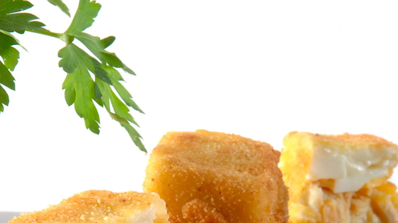 Corta la masa en porciones, pásalas por harina, huevo batido y pan rallado y fríelas en abundante aceite caliente. Retira a una fuente con papel absorbente. Sirve en una fuente cuadrada con una rama de perejil.