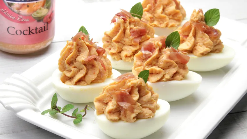 Receta de huevos cocidos rellenos de langostinos, palitos de cangrejo, salmón ahumado y con salsa cocktail.