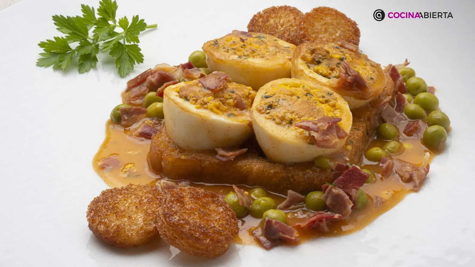 Karlos Arguiñano elabora en Cocina Abierta un plato con tradición: Huevos Teresita, un entrante sabroso, sencillo, rápido y fácil de preparar ¡unas tostadas de pan de molde con huevos cocidos rellenos con jamón serrano y guisantes! Irresistibles.