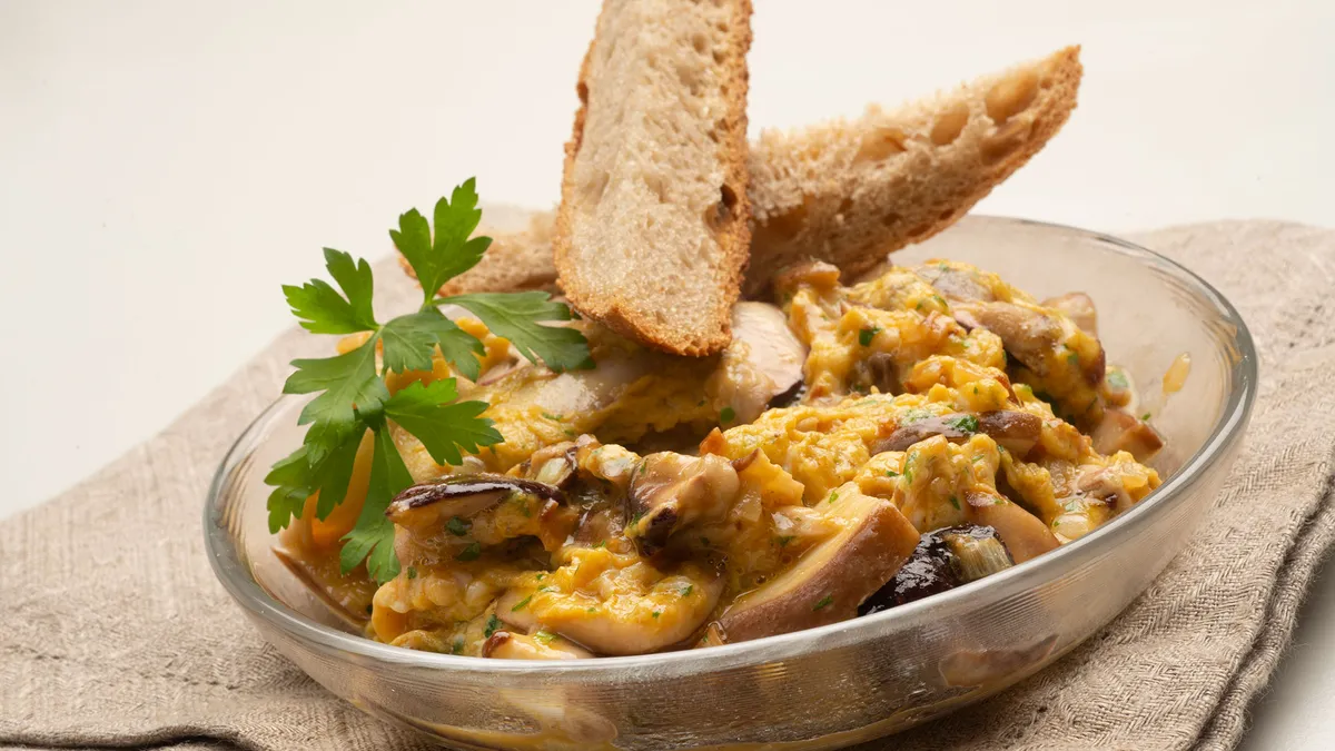 Sirve el revuelto y vierte por encima la yema de huevo. Acompáñalo con el pan troceado y decora con una hoja de perejil.
