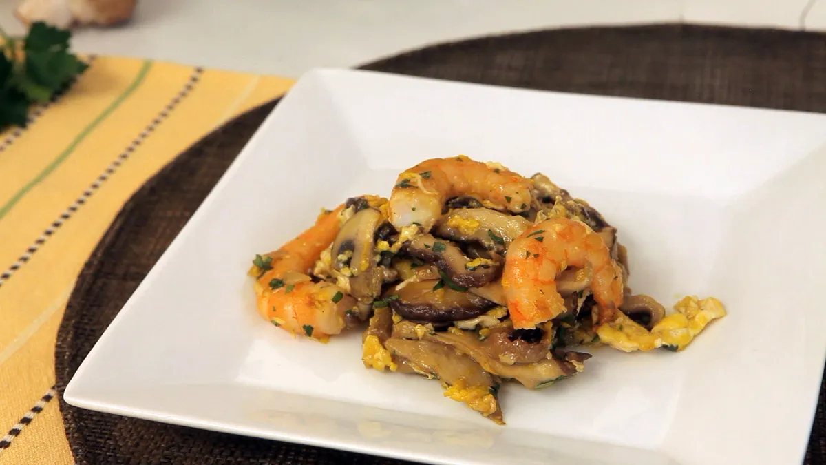 Receta de huevos revueltos con setas variadas y langostinos salteados con un toque de salsa de soja.