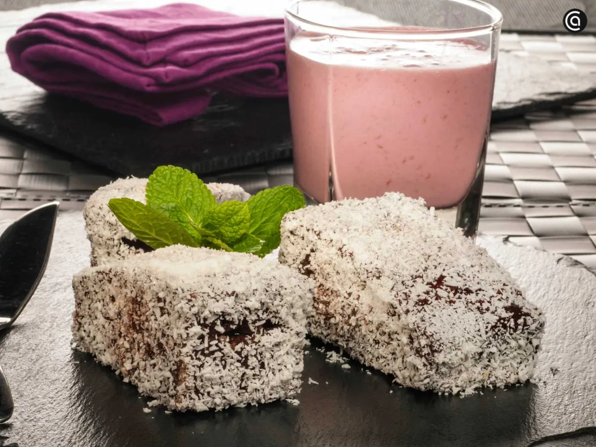 Los lamingtons son un postre tradicional australiano formado por porciones de bizcocho cubiertas con glaseado de chocolate y rebozadas en coco rallado.