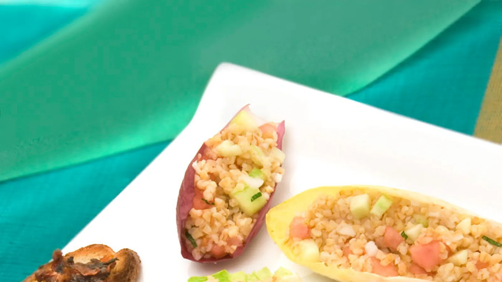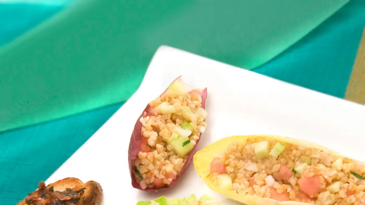 Rellena las hojas de endibia o cogollo con la ensalada de bulgur. Sirve 3 hojas rellenas en un plato y acompaña con las tostadas.