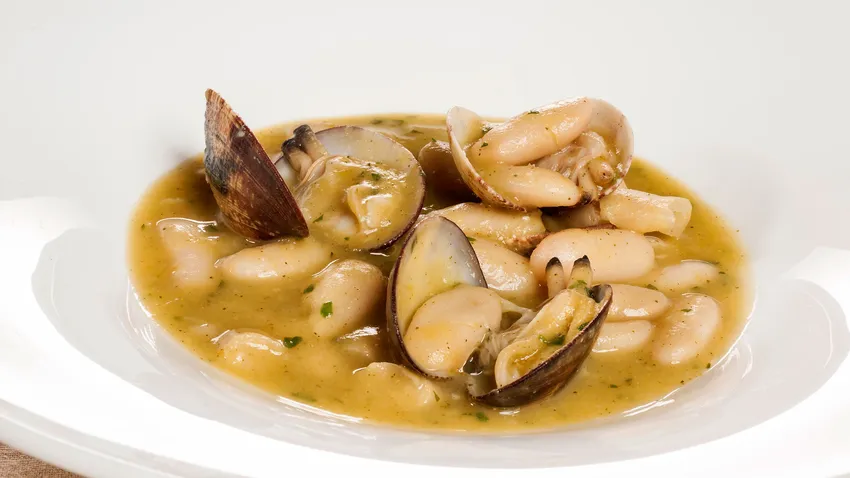 Bruno Oteiza elabora un plato de fabes con hortalizas y almejas frescas en salsa verde, receta inspirada en la cocina asturiana.