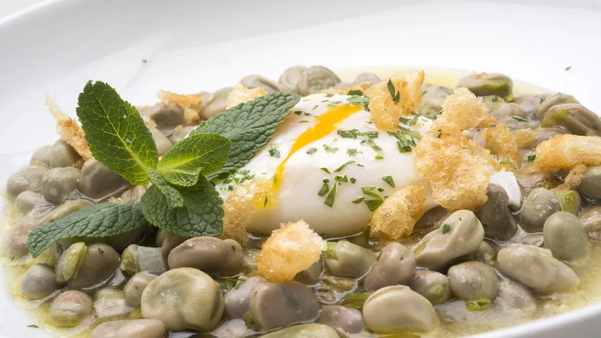 Sirve las habas, coloca encina un huevo escalfado y añade las cortezas picaditas. Espolvorea con perejil picado y adorna con unas hojas de menta. Sirve.