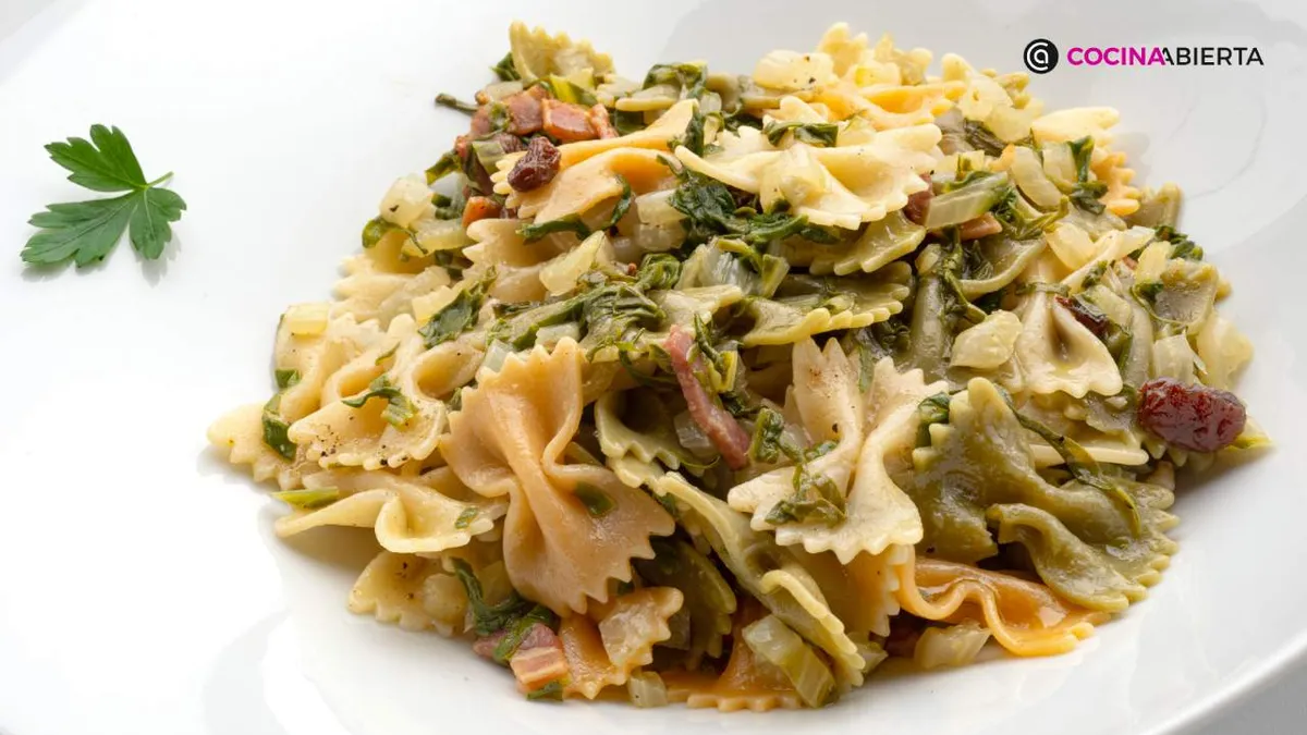La receta de pasta con acelgas de Karlos Arguiñano es fácil de hacer y combina un toque picante de guindilla con el sabor de la panceta y las pasas, creando un contraste delicioso entre lo salado y lo dulce.