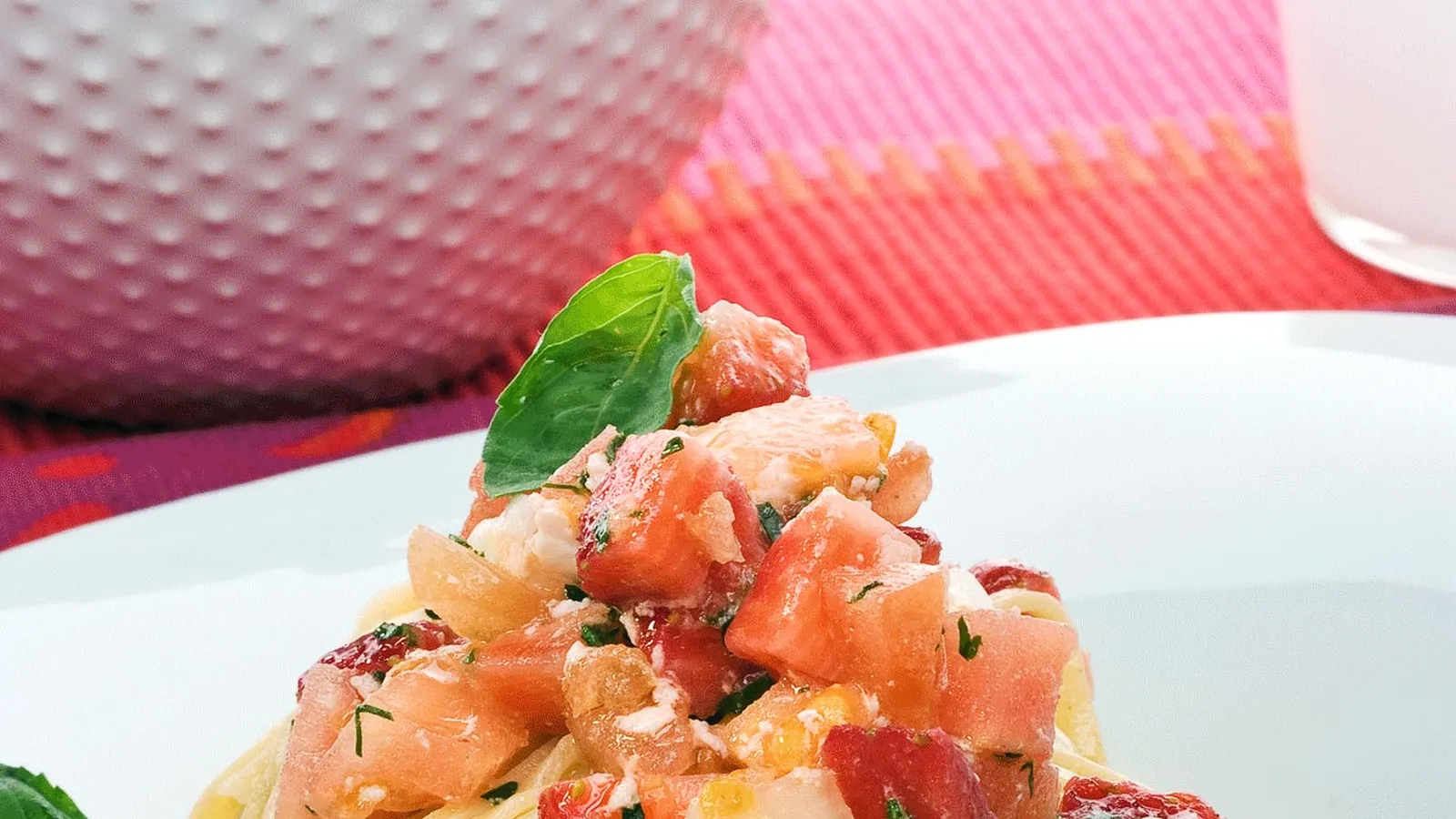 Receta de espaguetis caseros con tomate picado, mozzarella y albahaca y el toque de sabor de las fresas.