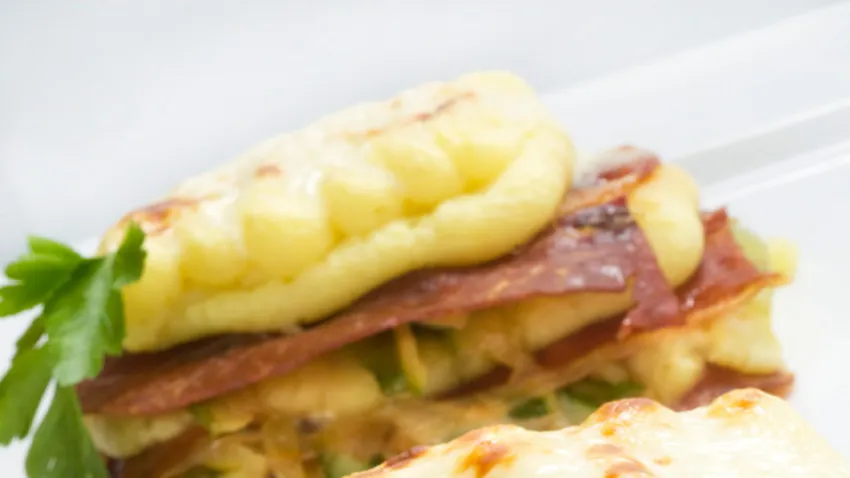 Sirve una lasaña de jamón y patata con queso por ración y decora con una ramita de perejil.