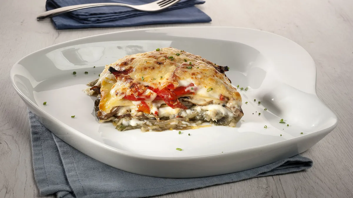 Receta de lasaña vegetal de berenjena, calabacín, champiñones, pimiento rojo, bechamel y queso gratinado, la propuesta de Amaia Urdangarin para los niños.