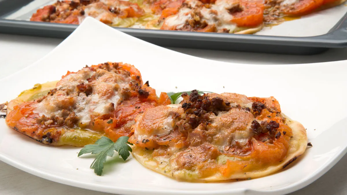 Receta de Karlos Arguiñano de mini pizzas de carne picada, txistorra y tomate asado con salsa de pimientos y queso gratinado.