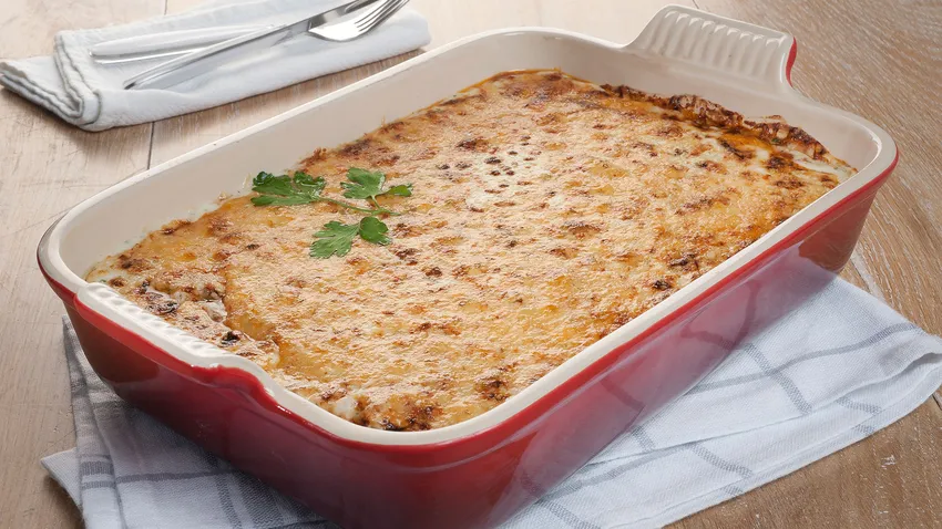 Cubre una bandeja apta para horno con una capa de lonchas de berenjena, cubre con otra capa de carne picada. Repite el proceso hasta terminar todos los ingredientes. Napa con la bechamel y ralla el queso por encima. Gratina en el horno durante 3-4 minutos. Sirve y decora con una ramita de perejil.