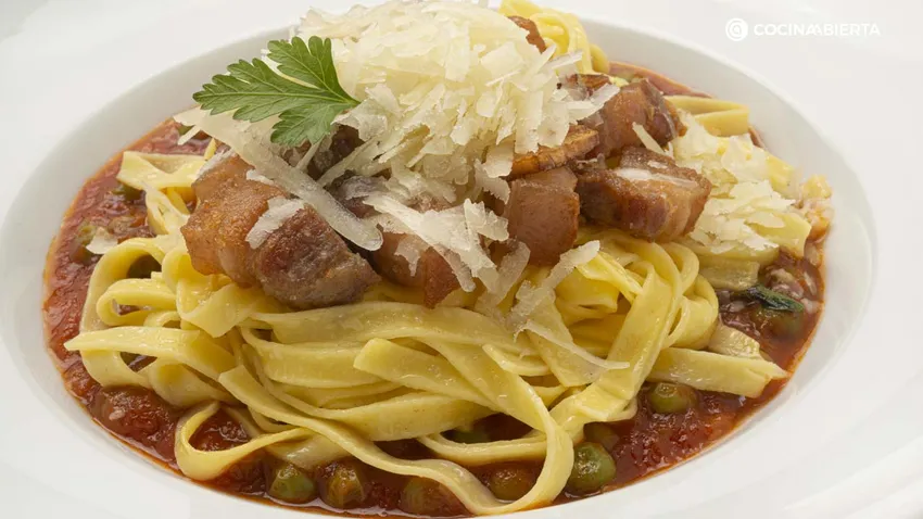 La panceta que utilizamos en esta receta de tallarines se diferencia del tocino en que este último está compuesto por poca carne y varias capas de grasa, mientras que la panceta se caracteriza por contener más fibras de carne magra.
